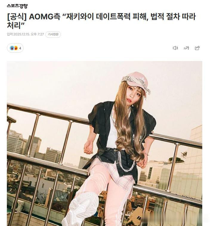 AOMG表示:“Jvcki Wai已向公司告知其在恋爱关系中遭到约会暴力的事实,目前正根据法律程序对该事实进行处理”、“我们以艺人的身心健康与恢复为最优先考虑,正在提供包括法律咨询在内的所有必要支持”、“目前此事正处于根据司法程序进行审查的阶段。对于可能影响调查及法律判断的具体内容,我们将不作进一步评论”。