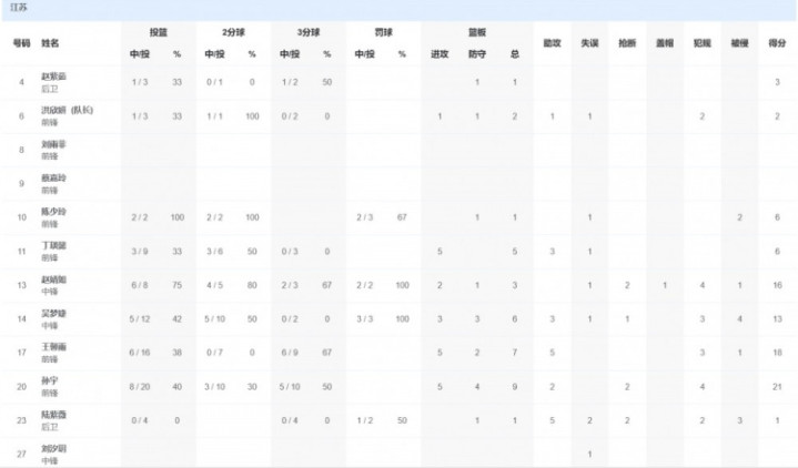 江苏队方面,孙宇21分9篮板2助攻,王馨雨18分7篮板5助攻,赵婧如16分3篮板2抢断。