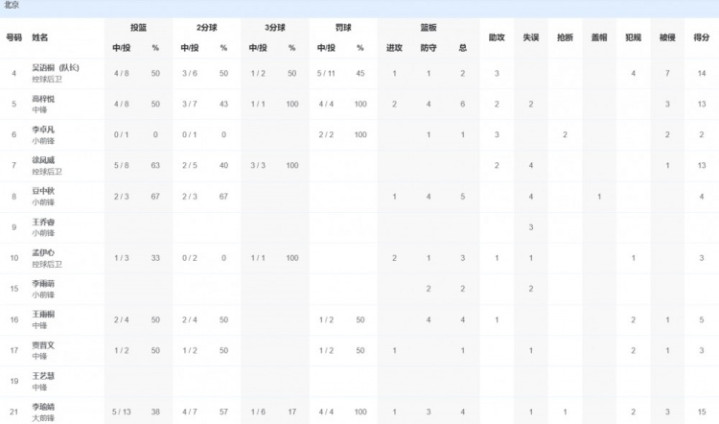 北京队方面,李瑜婧15分4篮板,吴语桐14分2篮板3助攻,徐凤威13分2助攻。