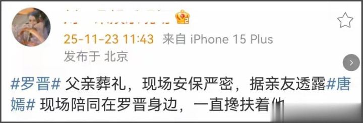 11月23日,农历十月初四,男星罗晋父亲在八宝山举行了葬礼,现场安保工作到位了,葬礼尽然有序,罗晋作为家里独生子捧着父亲遗照走在前面,而唐嫣则是跟着亲友走在后排,这明显人一看就是按照儿媳的站位来的,葬礼未见两个小孩参加。