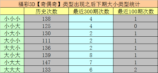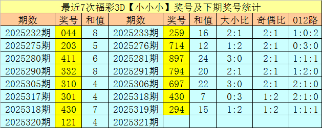 一、福彩3D上期奖号为121,大小类型开出:小小小,历史上该大小类型奖号共出现1060次,最近7次【小小小】奖号分别开出:044、203、411、332、310、301、430,其中组三号码出现3次,组六号码出现4次。