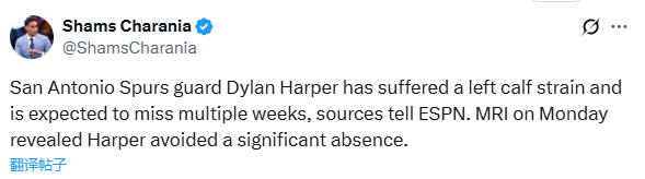 如今哈珀的伤情确诊为左小腿拉伤,预计伤停数周,所幸免遭重大伤病;马刺官方表示,迪伦-哈珀今天上午在洛杉矶接受的核磁共振检查显示,他的左小腿拉伤,但没有韧带损伤。他目前的状态是每日观察,至少会缺席本周的比赛。