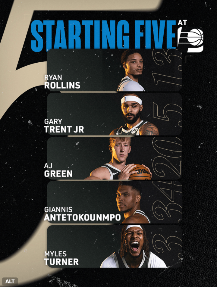 赛前,雄鹿官方公布本场球队首发阵容:莱恩-罗林斯、小加里-特伦特、AJ-格林、扬尼斯-阿德托昆博和迈尔斯-特纳。