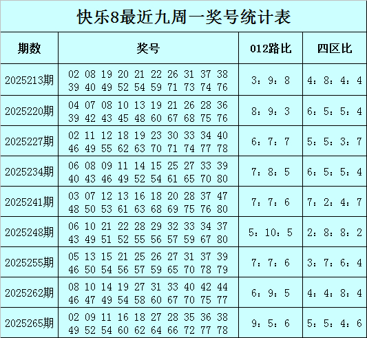 福彩快乐8第2025265期(上周一)开奖回顾:02 09 11 16 18 27 28 35 36 38 49 52 54 60 62 64 66 72 77 78,其中奖号四区比为5:5:4:6,012路比为9:5:6。